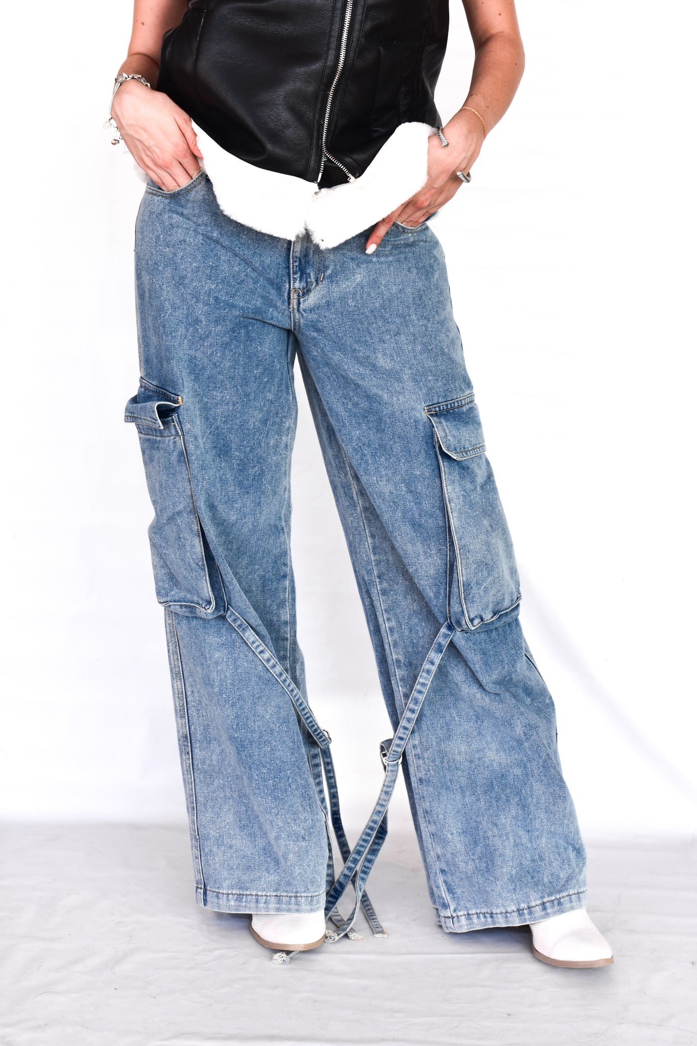 Pantalón de mezclilla tiro bajo con bolsillos y cordones en lados